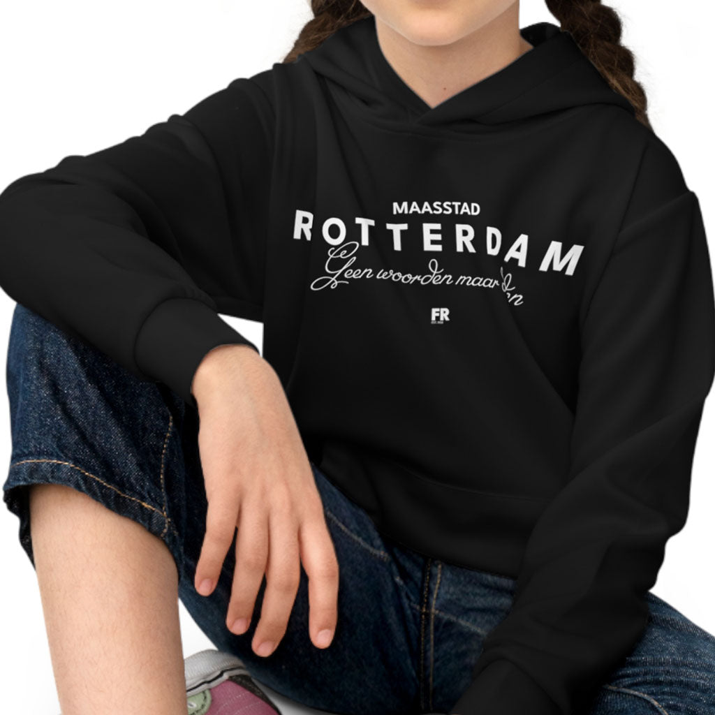 Hoodie regular zwart - kids - Rotterdam - Geen woorden maar daden - logo voor groot